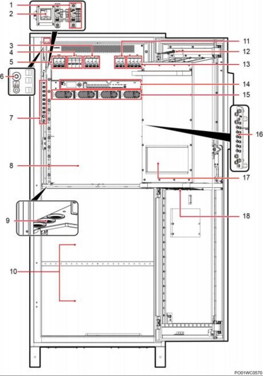(1)交流输出空开及端子 (2)维护插座 (3)次要负载支路空开 (4)交流防雷器 (5)交流输入空开 (6)静电接地点 (7)接地排 (8)用户设备安装空间 (9)走线孔 (10)电池安装空间 (11)重要负载支路空开 (12)内循环风扇 (13)电池空开 (14)监控单元 (15)整流模块安装空间