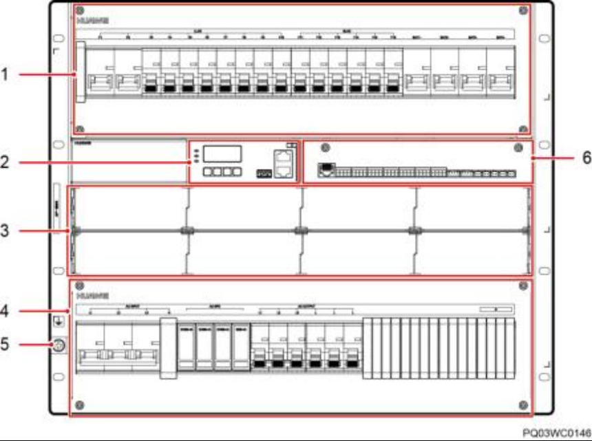 (1)直流配电单元 (2)SMU02B (3)整流模块安装空间 (4)交流配电单元 (5)接地螺丝 (6)UIM02C