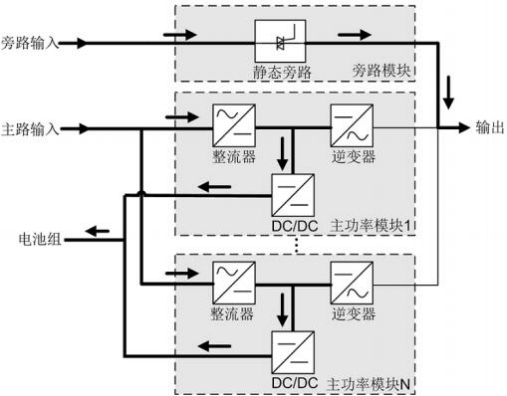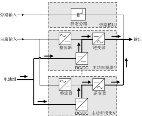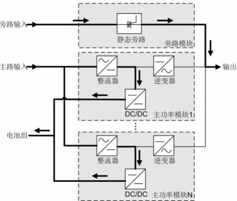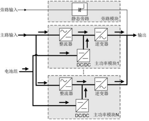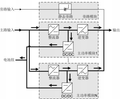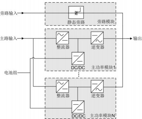 2.2.1 原理框图 UPS5000 属于在线式产品,采用模块化技术,易维护,易扩容。模块均采用 DSP (Digital Signal Processing)智能控制,功率模块由整流器、逆变器和 DC/DC 构成,通 过高频开关技术,将输入变换为纯净的、高质量的正弦波输出。