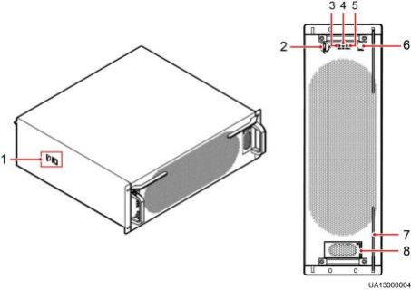 (1)限位锁 (2)就绪开关 (3)故障指示灯 (4)告警指示灯 (5)工作指示灯 (6)电池冷启动按键 (7)助力扳手 (8)辅助电源